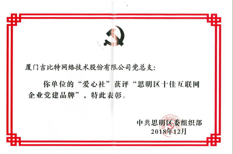 经初审评选、、、网络评选和专家评审等环节,,,"厦门亚星管理网络技术股份有限公司党总支-爱心社" 从全区28个参评党建品牌中脱颖而出,,获评"思明区十佳互联网企业党建品牌"。。。