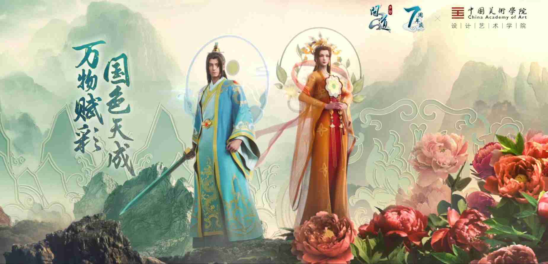 2023年4月,,《问道手游》联动中国美术学院,,,,在游戏中融合了中国历史上不同时期的文化元素,,打造了“山河万象”与“凤鸣九霄”的国风时装。。。在色彩配置方面,,,创作团队基于对游戏角色特性的分析提取相应的文化内涵,,,,从每一种色彩的色相、、指代事物和情感出发对应角色属性,,,,选定服装的色彩搭配。。。在纹样设计方面,,,,创作团队结合游戏角色自身特殊的造型比例和形态,,,,在实际的纹样设计中进行了游戏语境下的活化演绎。。。。男性角色集中使用了如蟒纹、、、、海水江崖纹、、如意纹和云气纹等传统纹样元素,,,女性角色则吸纳了凤凰纹、、、、牡丹纹、、、卷草缠枝纹等元素,,,,组成以“双凤牡丹纹样”“缠枝牡丹纹”“金玉凤冠头饰”为主要纹样的游戏角色装饰图案系统。。。