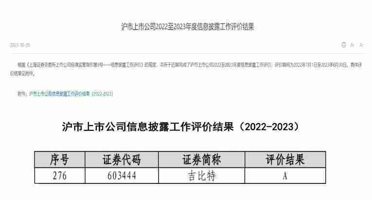 近日,,上海证券交易所发布2022-2023年度信息披露工作评价结果。。。。亚星管理(股票代码::::603444)凭借规范的公司治理、、、、高质量的信息披露以及良好的投资者关系管理再次荣获信息披露工作A级评价,,,公司连续两年获此殊荣。。